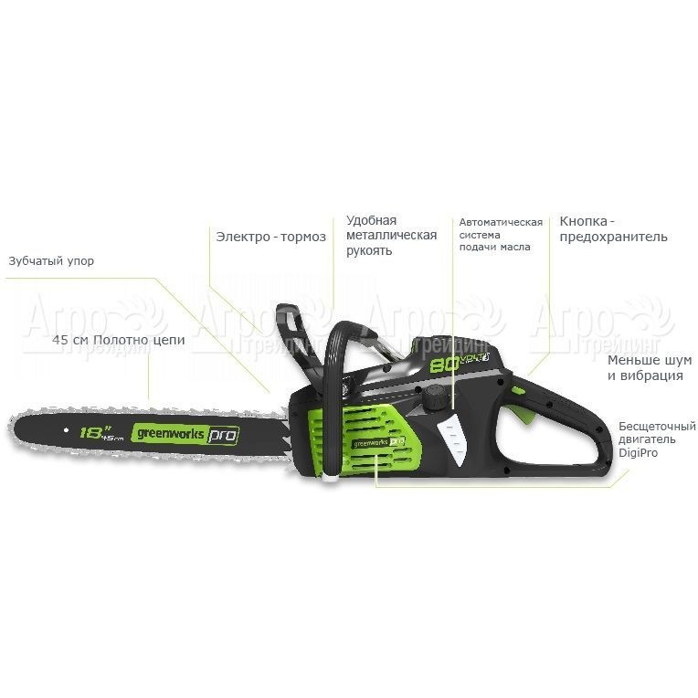 Характеристики товара: Аккумуляторная пила GreenWorks GD80CS50 80V-18Подробное описание товараАккумуляторная пила GreenWorks GD80CS50 80V-18" -надежный и качественный инструмент для распиловки древесины, который способен конкурировать с бензопилами объемом 45 см3. Преимущество аккумуляторной пилы GreenWorks GD80CS50 80V-18" - отсутствие токсичных газов, низкий уровень шума и вибрации, мобильность. Работает от 80 В литий - ионного аккумулятора, полного заряда, которого хватает для совершения 150 распилов. Комплектуется бесщеточным электродвигателем обеспечивающим высокую скорость вращения и продолжительную службу. Инструмент оснащен шиной и цепью торговой марки Oregon, имеет удобную систему натяжения цепи, позволяющей осуществлять регулировку одной рукой. Подача смазки на шину и цепь осуществляется в автоматическом режиме. Двигатель включается при нажиме на кнопку, предохранитель исключает случайный пуск. Обрезиненная ручка способствует гашению вибрацию и удобна для хвата. Электрический тормоз и сниженная отдача повышает безопасность работы с инструментом.