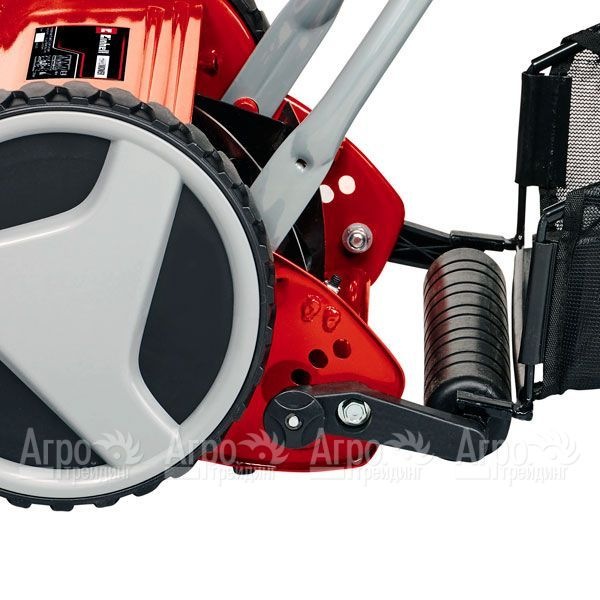 Садовая техника оборудована косильным валом, установленным на подшипниках. Пять острых лезвий легко справляются даже с густой растительностью, оставляя после себя красивый и ухоженный газон. Скошенная трава собирается в открытый травосборник, который легко снимается и вытряхивается. Широкие пластиковые колёса обеспечивают агрегату устойчивость и не оставляют следы на газоне.